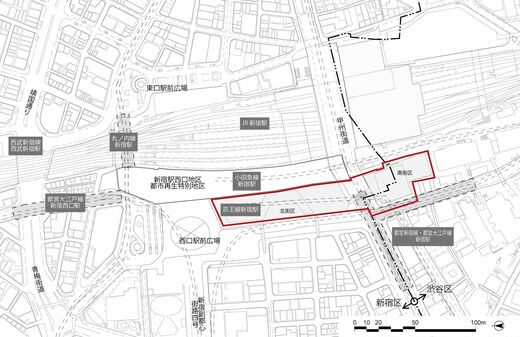 南街区は、新宿南口交通ターミナル(バスタ新宿)の西、JR東日本本社の北に位置する。現在建っている複数のビルにはバスタと同様に「新宿」の名が付くが、住所は一部を除いて「渋谷区」。甲州街道を渡る場合は横断歩道のほか、小田急百貨店と京王百貨店の間のモザイク通りに抜けられる「ミロードデッキ」が利用されている。
