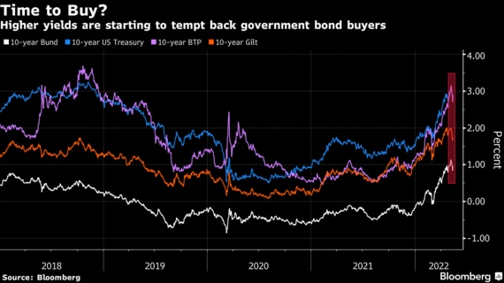 ブルームバーグの指数によれば、米政府債相場は年初から12日までの時点で既に8.4%下げ、少なくとも50年ぶりの2年連続下落の方向にある。世界的な指標も12%下げている。ただ、米10年債利回りは5月9日に3.20%と18年以来の高水準を付けて以降、約30ベーシスポイント(bp、1bp=0.01%)低下している。