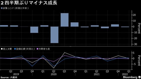2022年1-3月期の実質国内総生産(GDP)速報値は前期比年率1.0%減と、2四半期ぶりのマイナス成長となった。減少率は市場予想(1.8%減)よりも小さかった。新型コロナウイルス感染拡大で行動が制限された上、ロシアによるウクライナ侵攻の影響で物価が上昇する中、個人消費が減速した。内閣府が18日発表した。