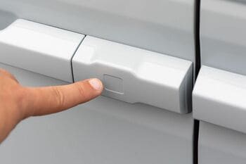 新型の両側パワースライドドアは、従来のドアハンドル操作に加え、軽く指先を触れるだけで開閉ができる静電タッチセンサー式を世界初採用している。静電タッチセンサー中央の凹部に触れると、スライドドアが簡単に自動で開く仕組みだ。ドアハンドルを手前に引くなどの操作が不要なため、小さな子どもでも簡単にドアの開閉ができる。