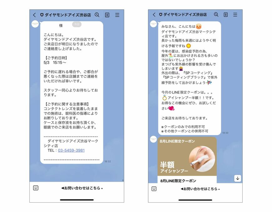 友だち追加したユーザーに、LINE公式アカウントから予約のリマインドメッセージを自動配信したり、 お得なキャンペーン情報を手動配信している
