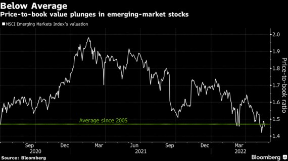 新興国株の指標、MSCI新興市場指数は今年に入り月間ベースで毎月下落。株価純資産倍率(PBR)は1.44倍に低下し、05年以降の平均の1.47倍を下回った。