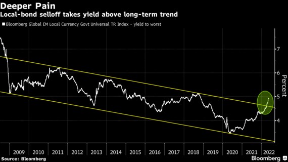 JPモルガン・チェースの指数によると、新興国債の米国債に対する上乗せ利回りは一時487ベーシスポイント(bp、1bp=0.01%)に拡大。15年に相場反転のきっかけとなった500bpの水準まであとわずかで、11年に反転につながった水準は既に上回っている。