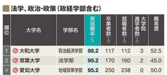 より細かい区分で学部系統別の実就職率(就職者数÷<卒業生数-大学院進学者数>×100で算出)ランキングを見ると、「法学、政治・政策」は、社会科学系の中で平均実就職率が83.3%と低い系統。法曹や公務員の志望者が多く、資格試験浪人が少なくないことが就職率が上がらない一因となっている。ランキングのトップは大和大学・政治経済で、以下、常葉大学・法、愛知大学・地域政策となった。
