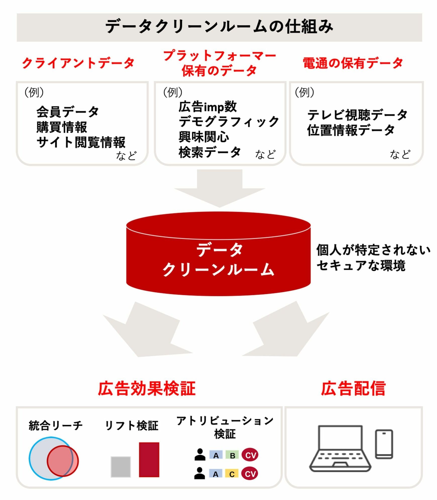 たとえ自社の保有するデータが限られていたとしても、データクリーンルームを使ってプラットフォーマーが持つデータと統合・分析することで、高精度なまま詳細かつ長期間の各種行動データが手に入るというわけだ。見逃せないのは、電通が持つテレビ視聴データなども活用できる点だ。