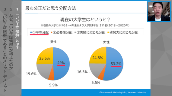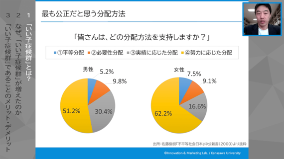 日本の過半数の人は当時、全世代が対象になっているんですけれども、いちばん頑張った人にいちばん多く分配するのがしっくりくる。それがフェアだと考える。次に多いのが成果を上げた人だと。とくに男性は、努力よりもいちばん成果に貢献した人に多く分配するべきだって考える人が約3割になっています。