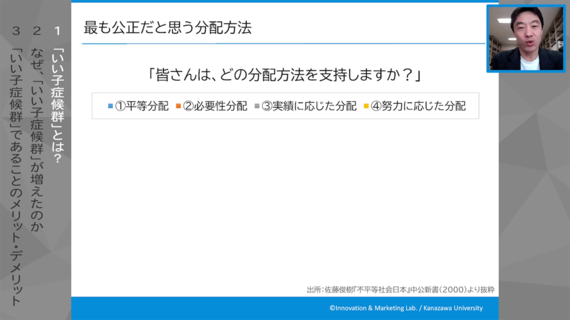 強調して申し上げますね。②③④のように、必要な人に多くするではなく、いちばん成果を上げた人に多くするでもなく、いちばん頑張った人に多くするでもなく、それらはすべて無視して、単純頭割りが自分にとってしっくりくる。これが今の大学生の過半の考え方になっています。