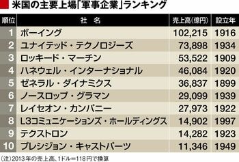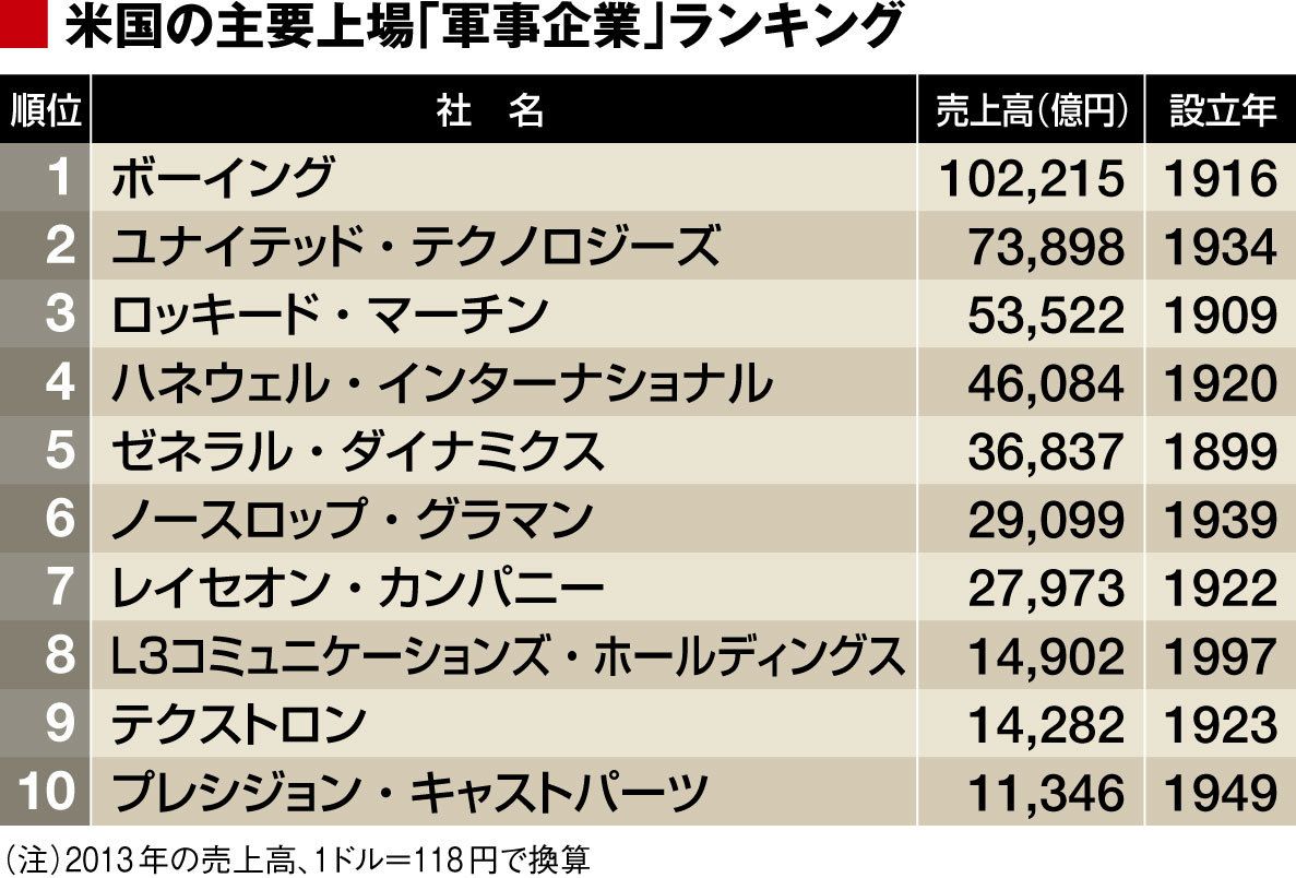 「米国会社四季報」の誌面データを利用した企業ランキング。前回は、「意外!これが米アパレル売上高ランキングだ」が好評だったが、最終回の第6回目は上場している「軍事企業」を採り上げる。米国では、主力製品がパトリオットなどのミサイルだったり、最新鋭のステルス戦闘機だったりと、どっぷりの軍事企業が当たり前のように上場している。