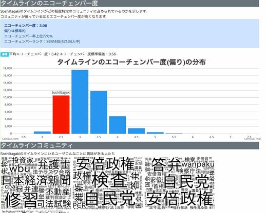 このシステムでは、自分のツイッターアカウントと連携させると、まずは本人のタイムラインがどの程度特定のコミュニティに占められているかを「タイムラインのエコーチェンバー度」として表示する。