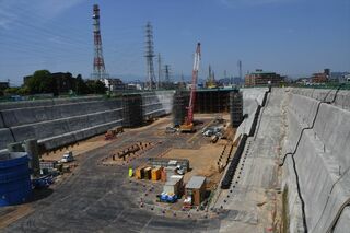 5月30日、雲一つない青空の下でJR橋本駅(神奈川県相模原市)近くに設置される予定のリニア新駅の工事現場が報道陣に公開された。この新駅は旧相原高校の跡地を活用して地下30mの場所に造られ、長さ約680m、幅は最大で50mという巨大なものだ。高校の敷地は工事スペースを広く取れるため地上から斜めに掘削し、建物や道路が隣接するエリアは地上から土を抑えるための仮土留壁を構築し、仮土留壁を支えるための支保工を設置しながら段階的に掘削する。「いろいろな工法で造られるのがこの駅の特徴」とJR東海中央新幹線建設部の吉川太郎担当課長が話す。