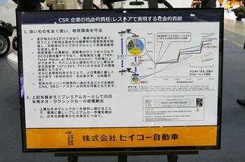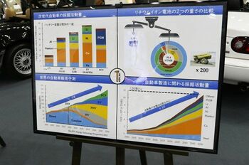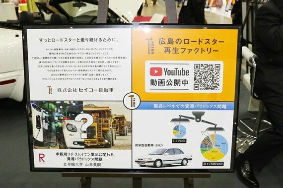 余談だが、セイコー自動車のブースには、非常に興味深いパネルが展示してあった。それは、立命館大学理工学部 機械工学科の教授・山末英嗣博士がまとめた「車載用リチウムイオン電池に関わる資源パラドックス問題」という研究資料だ。これは、旧車をレストアして乗り続けることは、結果的に地球環境を守ることにつながるという提言をまとめたもの。近年、世界的に導入が進むBEVやFCVなどは、たしかに走行中のCO2は出さない。だが、一方で、搭載するバッテリーなどは、製造段階でリチウムをはじめ多くの資源を必要とする。そして、BEVやFCVなどの次世代自動車の数が増えれば、資源の採掘量が増大し、ゆくゆくは地盤沈下など災害の要因となる危険性もあるというのだ。