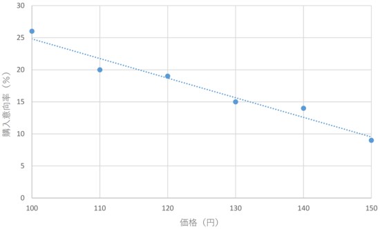 回帰分析における”直線の傾き”に注目しよう。傾きが右肩下がりになるほど、価格が増加したときに、購入意向率が減少する傾向があるといえる。