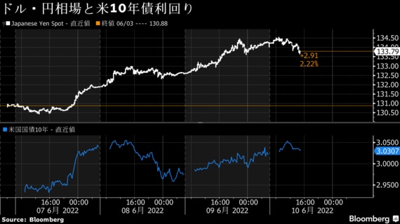 東京外国為替市場では円が対ドルで約20年ぶり安値から反発した。金融引き締めを急ぐ海外中銀と金融緩和を続ける日本銀行の政策かい離を背景に一時は1ドル=134円台半ばと2002年2月以来の安値を連日で更新。その後は米長期金利の上昇が一服する中、今夜の欧州中央銀行(ECB)による金融政策発表やあすに米消費者物価指数(CPI)を控えて徐々に買い戻しが優勢となった。円は対ユーロでも約7年ぶり安値付近から値を戻している。