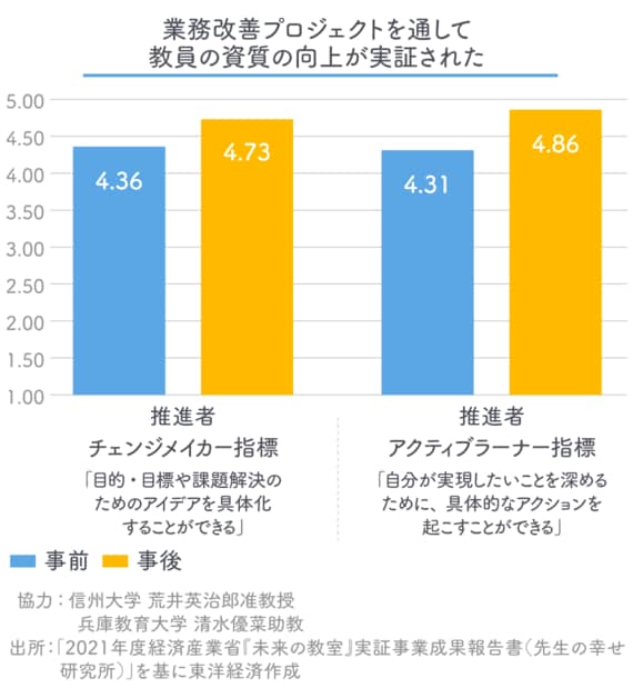 今回、信州大学の荒井英治郎准教授、兵庫教育大学の清水優菜助教と協力してこれらの3つを数値化してみたのですが、業務改善プロジェクトを通して、推進チームに立候補された先生方の「チェンジメーカー度」「アクティブラーナー度」が上がったことが実証されました。