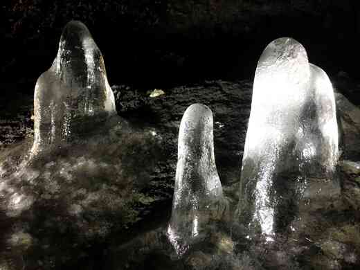 富士山の地下に染み込んだ水の過程が観察できるのが富士山の地下の世界、洞窟です。噴火した際の溶岩によって造られた洞窟の内部に入ると、地表から染み込んできた水が天井から滴り落ちて、また溶岩に吸収されていく様子を見ることができます。洞窟内部は年間を通じて低温のため、時期によっては天井からの滴り落ちた水がじっくりと時間をかけて凍りついた氷の芸術、氷筍(ひょうじゅん)も観察することができます。