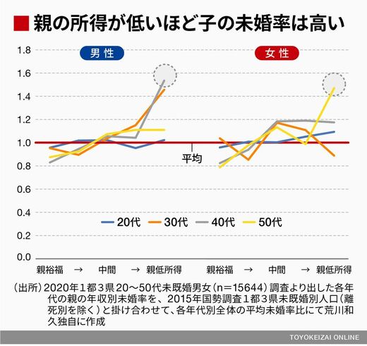男性の30~40代、女性の50代に関しては、親が低所得である人の未婚率が明らかに抜きんでて高いことがわかります。なぜそうなるかといえば、「親の所得で子の学歴が決まる→学歴で子の就職先が決まる→就職先で年収が決まる→低年収では結婚できない」という流れになるからです。