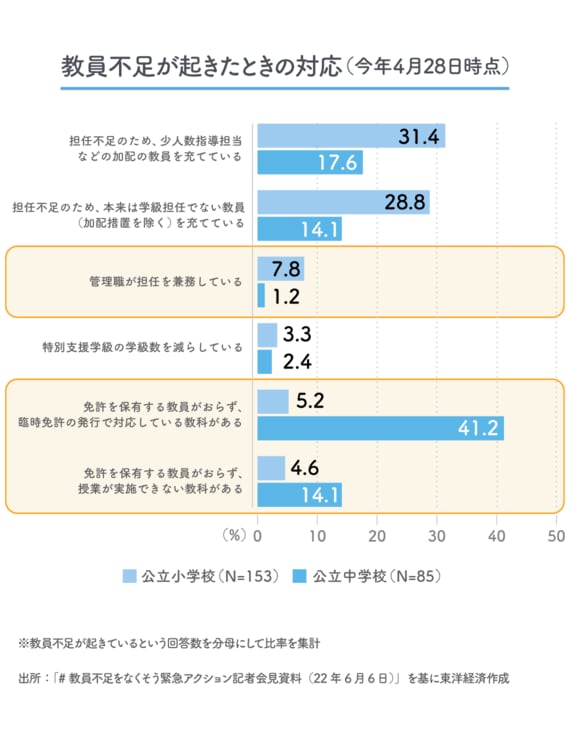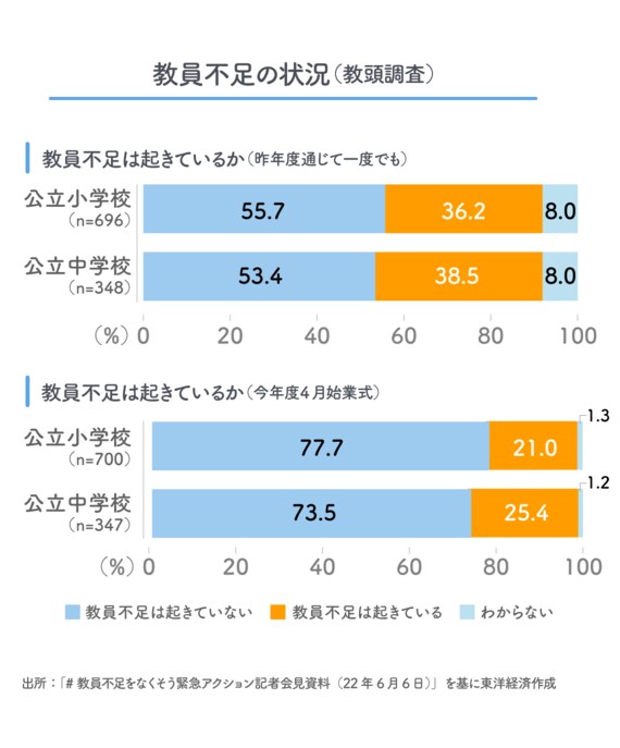 昨年度、文科省が初めて教育委員会向けに調査を行ったが、そこで判明した教員不足は、公立小中学校の4.8%ほどだった。今回の私たちの調査では、それよりもそうとう多くの学校で不足している可能性を示唆する。