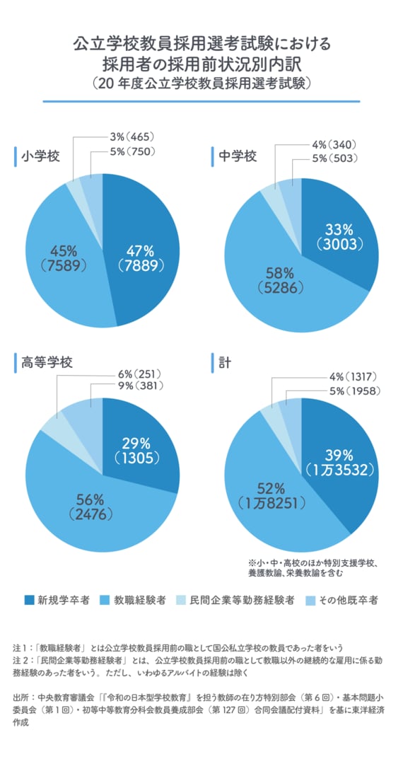 だが、採用者のうち、民間企業等勤務経験者は、小中学校で3~4%にすぎない。受験者についてのデータは公表されていないようだが、もともと企業等経験者の受験者も少ない可能性が高い。