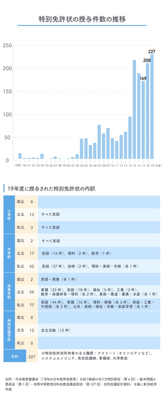 しかしながら、特別免許状の活用が今後もう少し拡大したとしても、数は全然足りないので、ここ1、2年の教員不足解消に有効な手だてになるとは考えにくい。