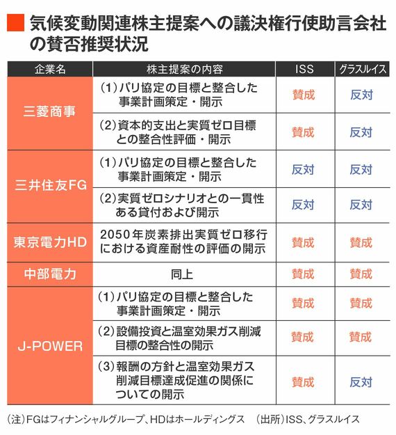東電HDおよび中部電に対する株主提案についてグラスルイスは、「気候関連の破壊的影響に対しての資産の耐性をどのように確保しているかを開示することは株主の利益に資する」と賛成理由を述べている。ISSは、「東電HDの2050年実質ゼロ目標達成は、同社および中部電の火力発電合弁会社であるJERAによる取り組みの成否にかかっている。株主がその取り組みを検証するための気候関連の情報が必要だ」と指摘する。