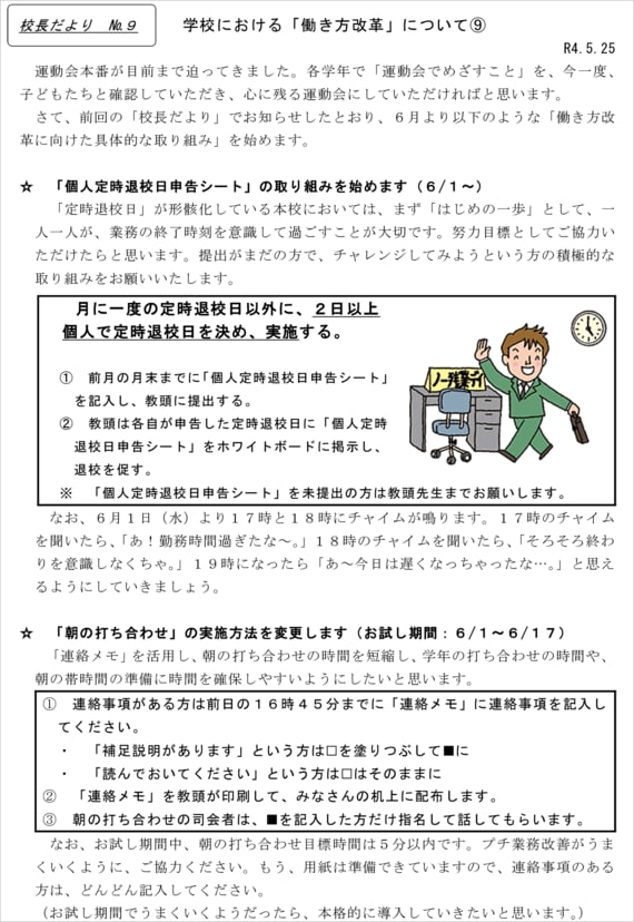 「勤務時間外在校時間の縮減は今までの働き方が否定されるようなもので、教員は受け入れがたいわけです。なので、なぜ働き方改革が必要か、ワーク・ライフ・バランスの本来の意味は何か、今の働き方は持続可能かといったことを教員向けに『教頭だより』を作って発信するなど、意識を耕すことから始めました。振り返ると、ここが最も働き方改革において大事な部分だったと思います」