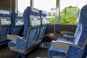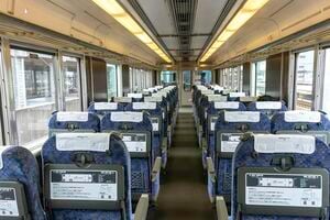 車内は中央ドアを埋めた前後間に特急普通車と同じ座席を並べ、出入口とは透明なガラス壁で軽く仕切ってある。少し背を倒せばゆったりと楽だし、背面テーブルや網袋もあるので飲食やパソコン作業も可。