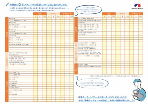 育休推進にあたり、同社では育休前に夫婦で家事育児の分担について話し合う「家族ミーティングシート」を作成。現在の家事育児の分担を確認したうえで、育休中、そして復職後の分担まで話し合える内容になっている。
