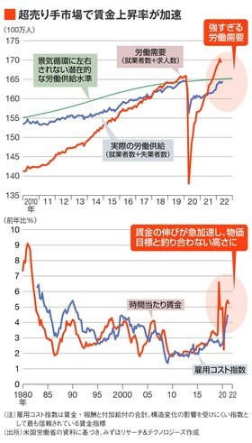 その結果、労働力の需要と供給に乖離が生じ、主要な賃金指標である雇用コスト指数や、時間当たり賃金が急加速している。賃金の伸びは、FRB(アメリカ連邦準備制度理事会)が掲げる2%のインフレ目標と釣り合わないほどの高さだ。
