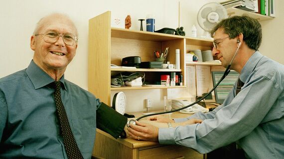 英国版かかりつけ医(GP)の診察を受ける高齢者。オフィスは至って質素(写真:Getty Images)