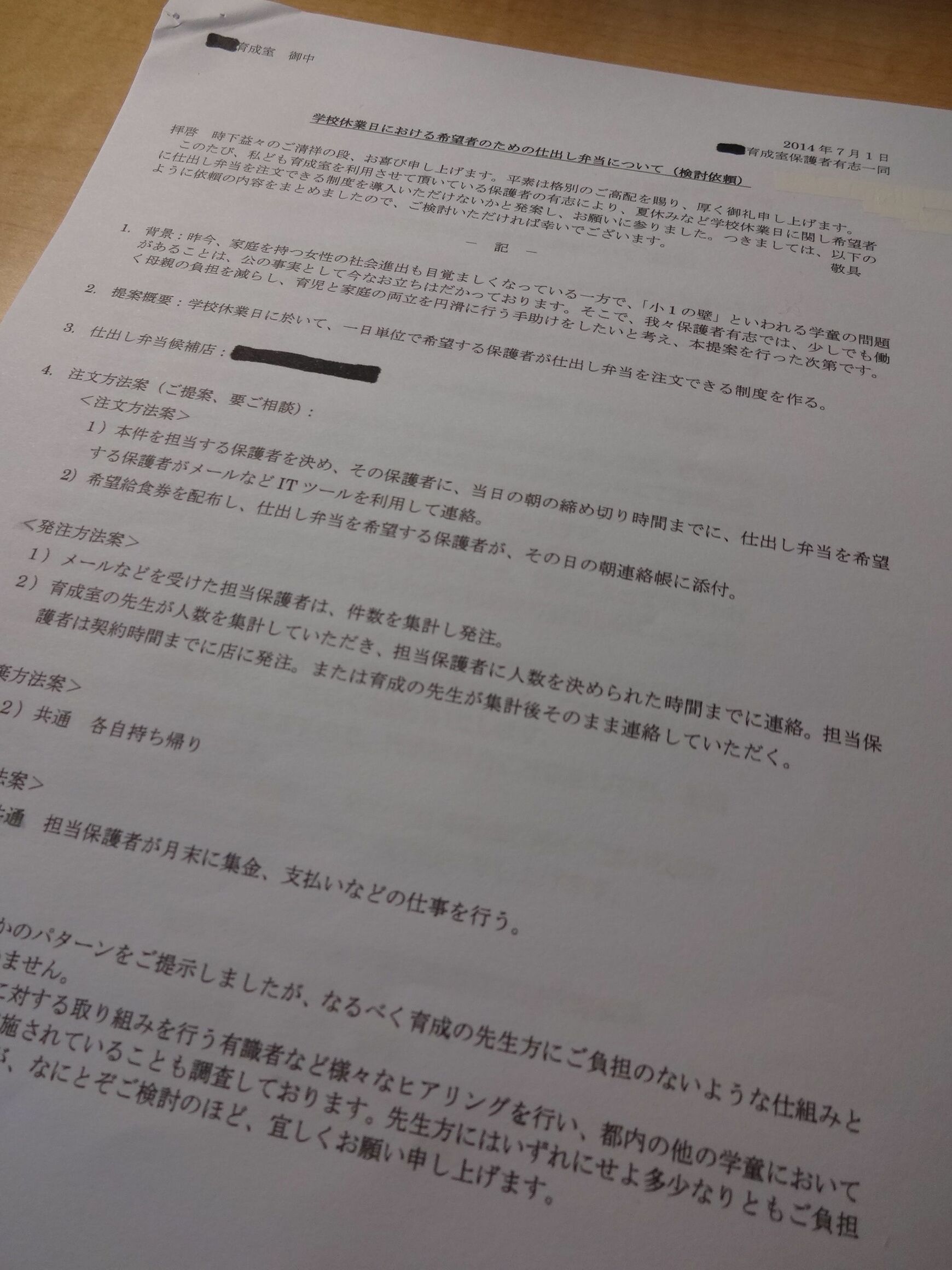 とはいえ、北区は基本的には、働く母親への支援には前向きな自治体。最初は難色を示していましたが、佐藤さんの熱意にも押され、要望を実現しようと北区の全児童館長が集まる協議会で審議にかけてくれました。その結果、9月末、ついに仕出し弁当利用の許可が下りたのです。