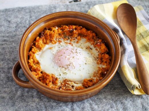 2)1をココット等に入れて中央を少しくぼませてたまごを割り入れ、オーブントースターで5分ほど、卵が半熟状に火がとおるまで加熱する。