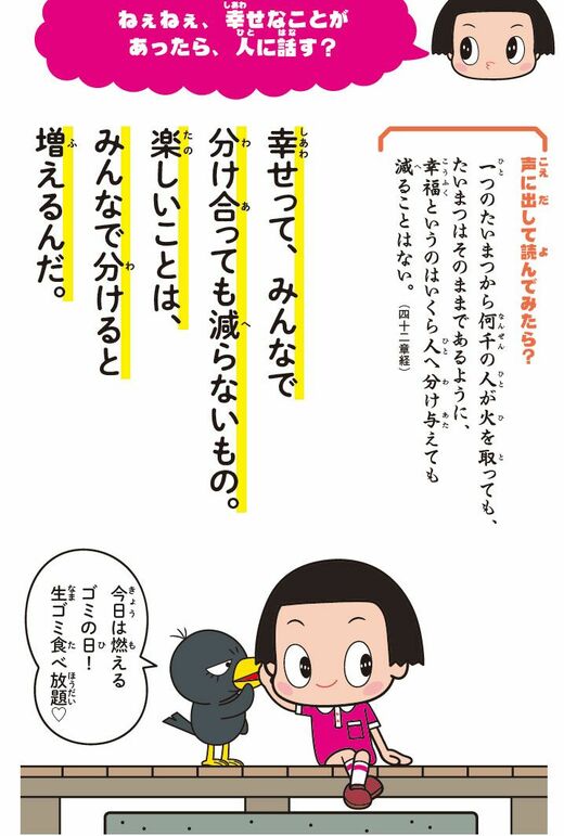 幸せの増やし方を覚えておこう。それは、幸せな気持ちをみんなと分かち合うことだ。たとえば、学校で楽しいことがあったら、おうちの人に教えてあげよう。おうちの人は、君が楽しんでいるのを知って、君が考える以上にうれしい気持ちになるんじゃないかな。