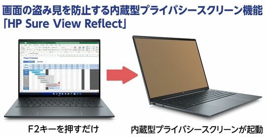 たとえば、外出先ではPC画面の盗み見のリスクが増大するが、HP Elite Dragonfly G3は内蔵型プライバシースクリーン機能「HP Sure View Reflect」を搭載する。ボタンひとつで即座にプライバシースクリーンを動作させ、PC画面の盗み見を防ぐことができるため、電車や航空機での移動中でも安心して作業を続けることができる。また、不審なURLのクリックやメール添付ファイルの展開を、PC内の仮想環境で実施する「HP Sure Click」は、うっかり攻撃を受けてしまっても、そのこと自体をなかったことにできる。従来のウイルス対策ソフトが見逃してしまうような未知のマルウェアもディープラーニングAIが検知する「HP Sure Sense」もある。これらは機能限定版ながら標準装備されているので、導入直後から利用できるが、有償版は対象ファイルの種類が拡大するなど、守備範囲が大幅に広がっている。外使いが前提のPCなら有償版を検討したいところだ。