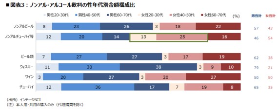 次に、ノンアルとアルコール飲料の購入者の顔ぶれに違いがあるのかを見てみたい。図表3は、全国の男女約5万2500人のモニターから買い物データを継続的に聴取している「インテージSCI」から、2022年1~5月合計のノンアル・アルコール飲料の性年代別金額構成比を確認したものだ。