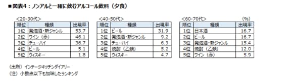 ここでは、2人以上の家族で自宅での調理機会が一定程度ある主家事担当女性を対象とする、インテージ食卓調査「キッチンダイアリー」を用いた。図表4は、夕食でノンアルを飲む際に、どういったアルコール飲料が飲まれるのかを年代ごとに出現率ランキングで比較したものだ(期間は2022年1~5月計)。