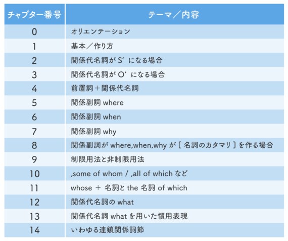 私の研究では、大学入試センター試験(現・大学入試共通テスト)の英語問題を題材にしたのですが、駿台国際教育センターの英語講師でオンライン英語スクール「E Cubed」を運営している駒橋輝圭氏の協力の下、英文法の関係詞というテーマを以下のようなチャプターに分割し、学習者に視聴してもらいました。