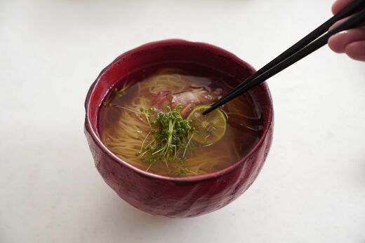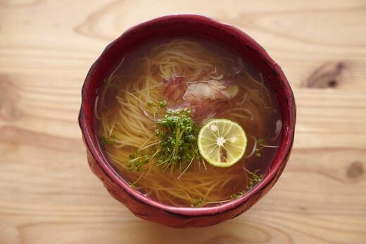 薬味をのせたら出来上がりです。すだちのスライスを添えると一気にさわやかさが増します。思い切って薄味に仕立てているので、はじめは物足りなく感じるかもしれません。汁まで飲める濃さにしているからですが、あまりにも薄いと感じられたら、うす口しょう油を大さじ3まで増やす、あるいは薬味として柚子胡椒を落とすのがオススメです。