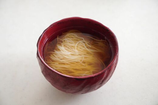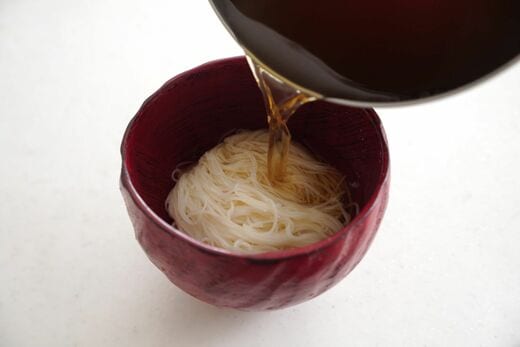 そうめんを器に入れて、冷たいかけだしを注ぎます。
