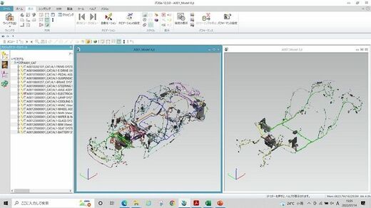 ECUを集約化することで部品点数が減らせる。その最たるものが、電装部品を繋げるワイヤーハーネスだ。上図はケアソフトの3DCADデータを使って、モデルXとモデルYで使われるワイヤーハーネスを示したもの。使用量の違いは一目瞭然だろう。このように部品点数を減らした分だけ、生産工程の簡素化、コスト削減につながる。