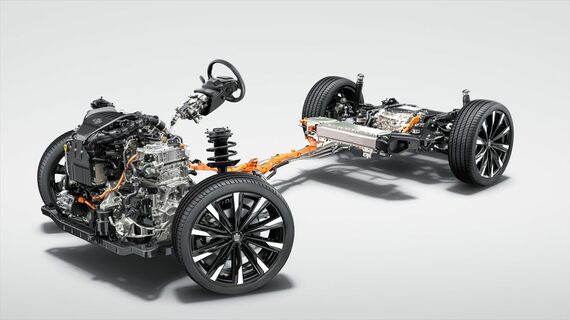 もう1つは、「デュアルブーストハイブリッドシステム」と呼ばれるもので、2.4リッターエンジンにターボを装着。リヤに高出力モーターを搭載する「eAxle」と「E-Four Advanced」4WDシステムを採用した、ハイパフォーマンス仕様だ。システム最高出力は247kW(349ps)、最大トルクは550Nmになるという。