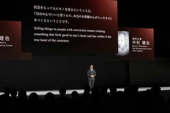 新型クラウン発表会で、豊田章男社長は歴代クラウンの話からはじめた。
