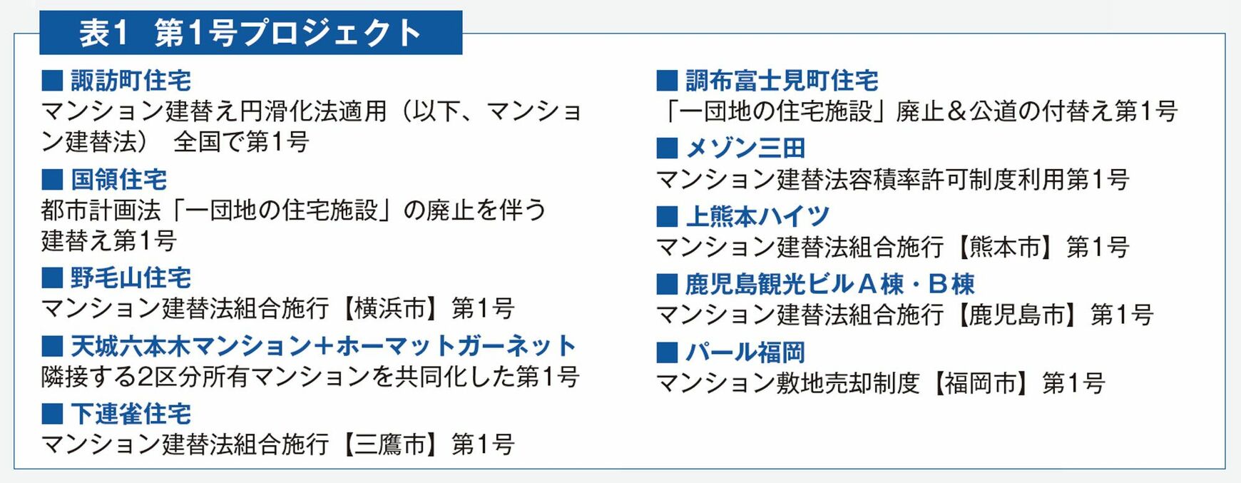 高経年マンションの増加を受けて法整備も進みつつある。研究所では時代の変化に応じ、その都度適した建替えフローを構築している。こうした積み重ねにより、建替えが難しいとされていたマンションに、新たな制度や法律を適用して建替えを実現した「第1号事例」をいくつも成功させてきた(表1)。その1つが、東京都調布市の「調布富士見町住宅」だ。研究所 副所長の花房奈々氏はこう説明する。