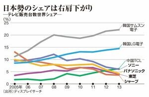 テレビ事業の海外生産体制を見直しているのは、パナソニックだけではない。価格の急速な下落、韓国勢や中国TCL、米ビジオといった海外メーカーの猛攻によって、日本勢の世界における販売台数シェアは、ジリジリと減り続けている。