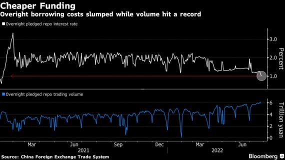 中国の銀行システムには十分過ぎるほどの流動性があるものの、借り入れ需要が低調なままで、銀行間の翌日物レポ金利は昨年1月以来の水準まで低下した。