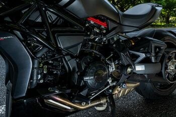 まず、「Black on Black」については、ドゥカティのアイデンティティとも言えるフレームデザインを、美しいマシンシルエットに同化させることで、プレゼンスの向上に成功している。一方、走りの心臓部とも言える伝統のL型2気筒DVT1262ccテスタストレッタエンジンのヘッドカバーは、ドゥカティのパッションを表現したレッドにペイントされ、その存在感をライダーに伝える。