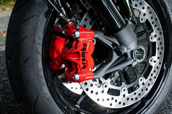 前後におごられたブレンボ製のディスクパッケージも秀逸だ。エンジンヘッドカバーに合わせてレッドに塗られたフロント4ポットキャリパーは、320mmのWディスクを容赦なく押さえつけ、マルゾッキのフロントフォークに適切な加重を与えてマシンを止める。