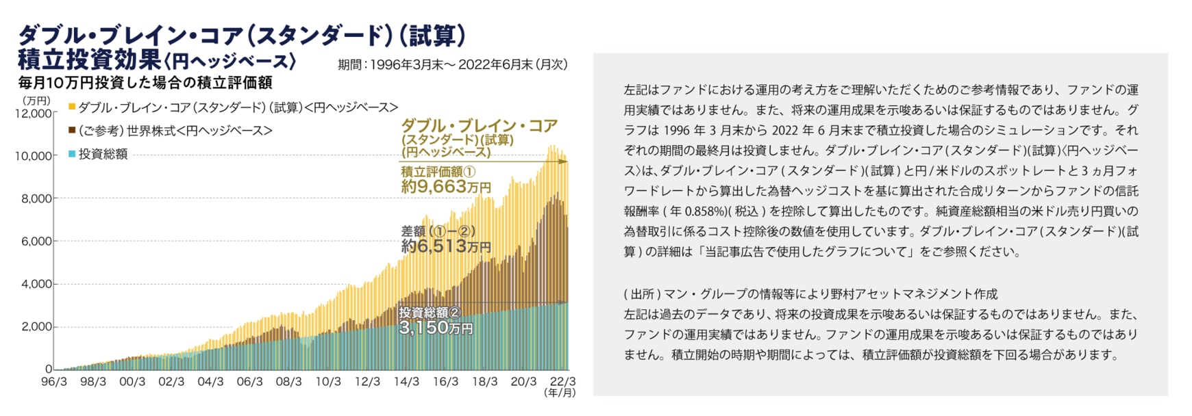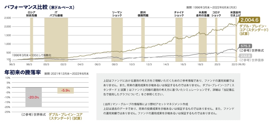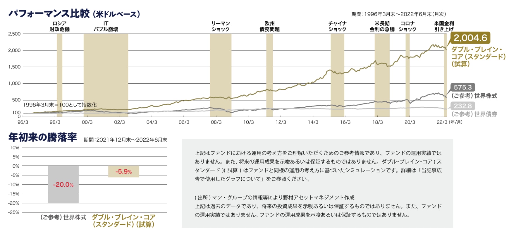 1996年3月末〜2022年6月末の期間では「ダブル・ブレイン・コア」(試算)は世界株式より高いパフォーマンスとなっており、同期間のリスクを比較すると、世界株式が年率15.6%なのに対して「ダブル・ブレイン・コア」(試算)は9.9%とより低いリスクで運用を行えている。さらに、危機に強い特性も世界株式の下落率と比べると明らかだ。例えば07年10月末〜09年2月末のリーマンショックの際に世界株式は54.6%も下落したが、「ダブル・ブレイン・コア」(試算)の下落幅は8.1%にとどまった。コロナショックにおいても、世界株式の21.3%の下落に対して、「ダブル・ブレイン・コア」(試算)の下落幅は0.4%と善戦した。