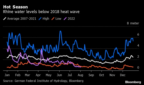 欧州は既にこの数十年で最悪のエネルギー供給危機に見舞われている。ロシアが天然ガス供給を制限し、インフレを加速させているためだが、今度は気候変動で欧州のこうした問題が深刻化しつつある。欧州各国政府はエネルギー危機がきっかけとなり域内がリセッション(景気後退)に陥る事態を避けようと取り組んでいるが、ライン川が航行不能となれば、燃料や化学製品などあらゆる産品の物流が滞る。