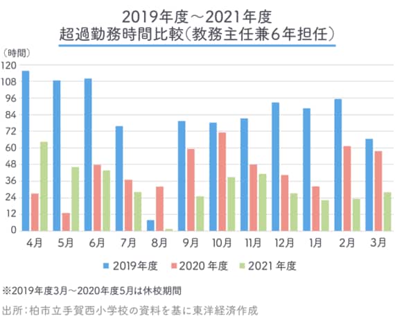 柏市のデータにも成果が表れている。21年度のフルタイムの教職員(管理職を除く)の平均在校時間は、市内の小学校が1日当たり10時間51分に対し、手賀西小は10時間1分。年間にして約167時間も短い。直近、22年6月の教職員の残業状況も、市内小学校では残業45時間以上が638人、80時間以上が93人、100時間以上が11人いたが、手賀西小ではゼロだ。