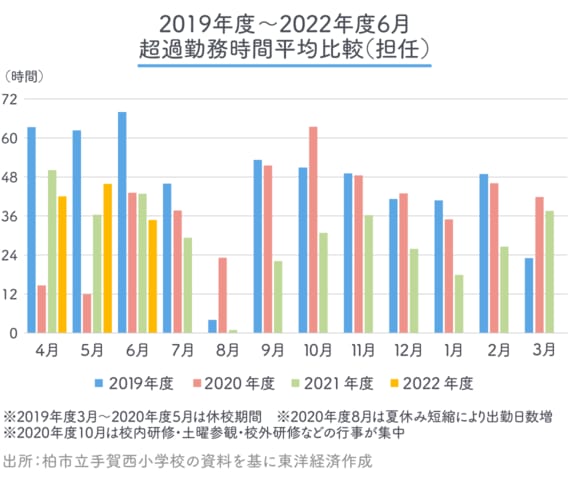 19年度から22年度6月までの担任の超過勤務時間の推移(下図)を見ても、明らかに減少傾向にあることがわかる。
